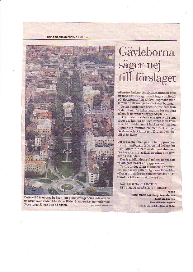 Gefle Dagblad Insändare 070502 Gävleborna vill inte ha bibliotek på Slottstorget!