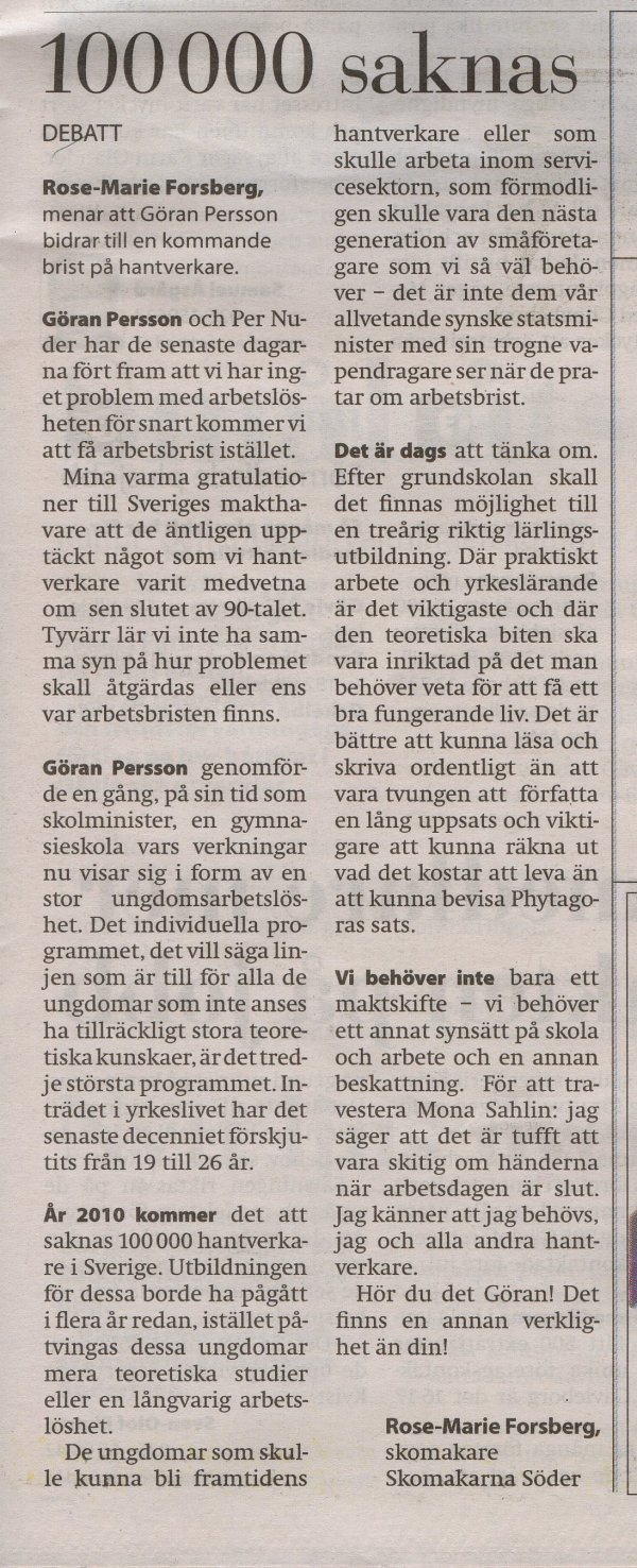 Gefle Dagblad Debatt 060830 Brist på Hantverksutbildning